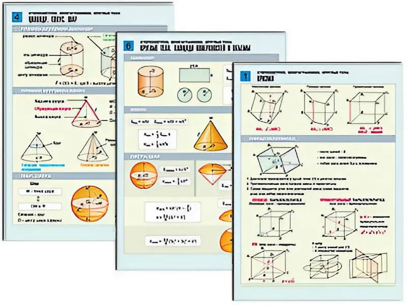 Комплект таблиц по геометрии "Стереометрия. Многогранники. Круглые тела" раздаточные (цветные, ламинированные, А4, 6 штук)