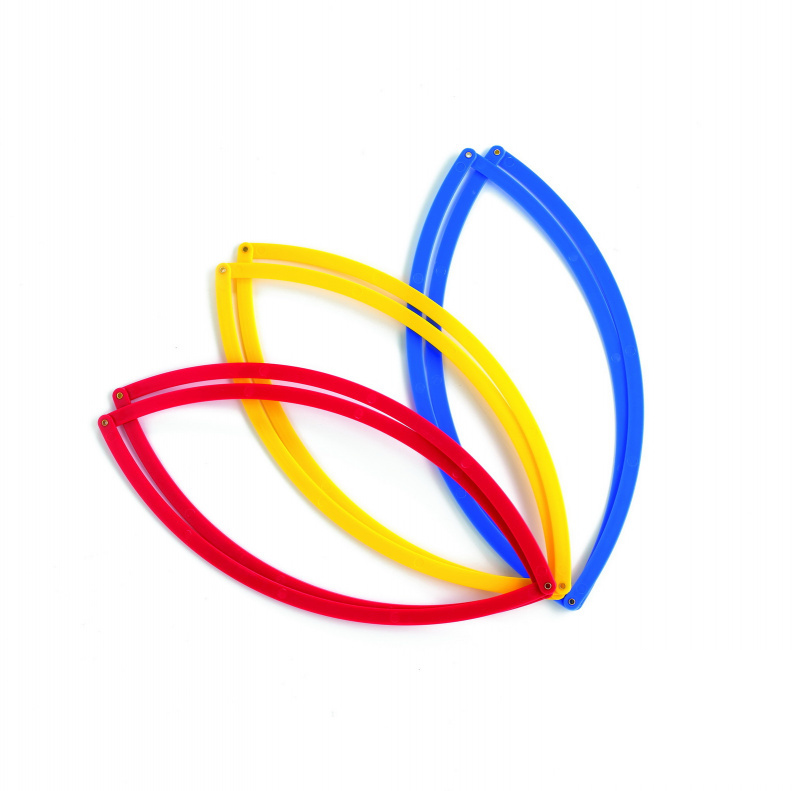 В наборе 6 колец, диаметр каждого 50 см, 3-х цветов: красный, желтый, синий.