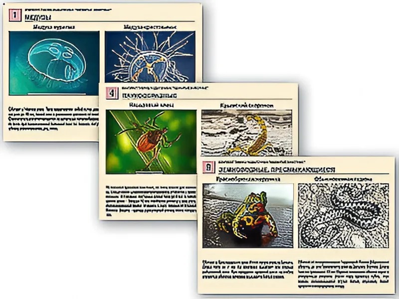 Пособие состоит из 9 полноцветных листов, напечатанных на картоне и ламинированных пленкой. В пособии представлены фотографии 18 видов ядовитых животных, наиболее распространенных на территории России.