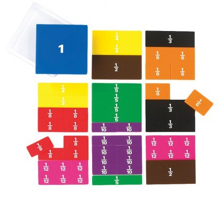 Набор состоит из 51 пропорциональных частей квадрата, демонстрирующие целые и половинные значения, третьи, четвертые, пятые, шестые, восьмые, десятые и двенадцатые части, напечатанных на каждом квадрате.