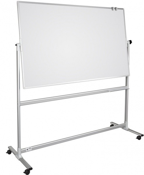 Передвижная поворотная доска установлена на металлической стойке, позволяющей ей поворачиваться вокруг горизонтальной оси. Две рабочие поверхности — из стального полимерного листа с антибликовым покрытие. Обрамление доски — высокопрочный алюминиевый профиль, благодаря чему имеет высокую износоустойчивость и прочность. Положение доски можно зафиксировать под любым углом, благодаря механизму на одной из вертикальных стоек. Вы также можете размещать дополнительные наглядные материалы, плакаты и использовать доску в качестве экрана для проектора. Имеется лоток для мела/маркеров и принадлежностей.