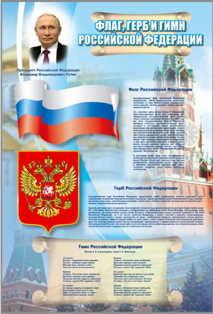 Стенд представляет собой панель, на которой размещена информация о государственном гербе, флаге и гимне РФ.