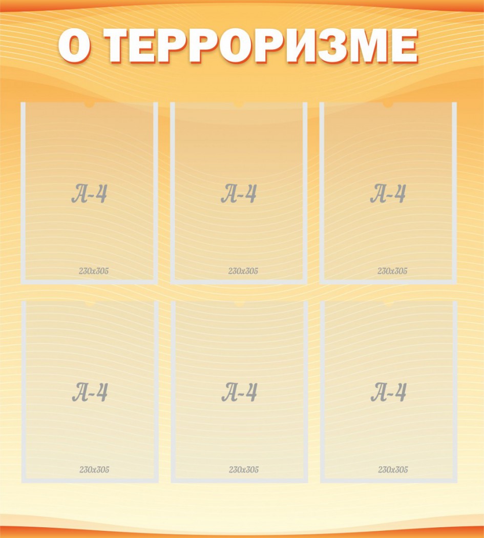 К сожалению, в современном мире все больше набирает обороты проблема терроризма. Это ужасное явление происходит во всем мире, поэтому и дети и взрослые должны знать, как поступить в такой ситуации и какие последствия терроризм приносит в общество. На данной модели стенда можно повесить любую информацию о терроризме, о его появлении, факторах и, конечно же, последствиях. Каждый должен знать, что делать в таких ситуациях, чтобы сохранить свою жизнь. Стенд имеет вертикальную форму и 6 ячеек для информации на листе А4. Такой стенд станет полезной информационной основой в каждой школе, поэтому его необходимо разместить в холле на самом видном месте.