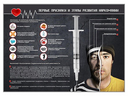 Стенд предназначен для наглядного отображения информации о признаках и этапах развития наркомании.