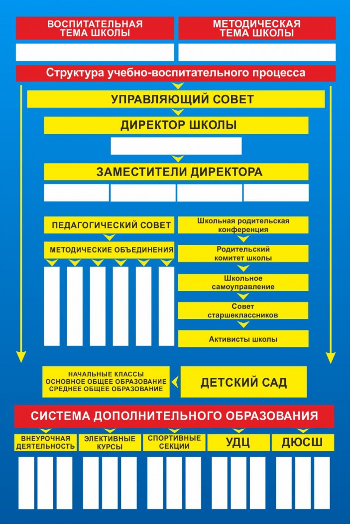 Одним из главных стендов в холле каждой школы должен быть стенд «структура школы». На нем представлены все должности сотрудников школы в иерархическом порядке. Удобная вертикальная таблица, и не пестрые цвета фона делают этот стенд очень приятным для восприятия. Изготавливается такой стенд из пластикового листа ПВХ, который отличается своим легким весом, поэтому удобен в транспортировке и установке. Стенд «структура школы» не имеет карманов для листов, а только не большие отсеки для вставки ФИО сотрудников. Данная модель стенда – это отличный выбор по соотношению цена/качество.