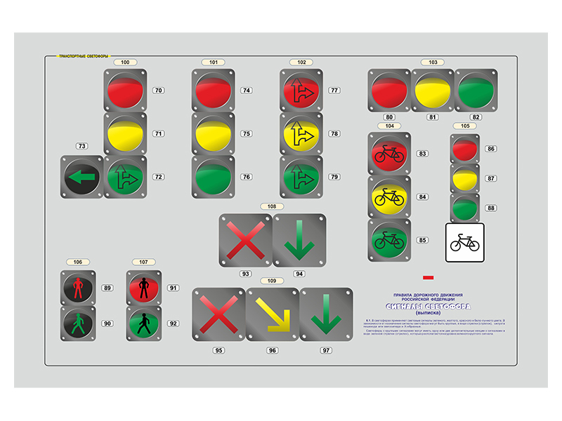 Базовый комплект светового оборудования представляет собой набор из трех информационных панелей, на двух из которых размещены световые элементы в виде дорожных знаков согласно ГОСТу Р 52290-2004, а на третьей панели – световые элементы в виде дорожных светофоров согласно ГОСТу Р 52282-2004. Всего на панелях размещено 97 световых элементов.