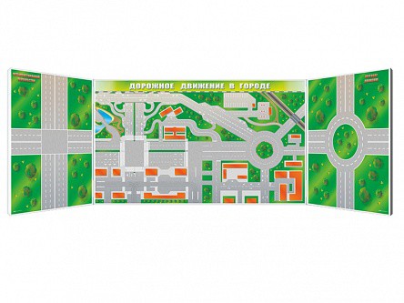Панорамная трехэлементная комбинированная магнитно-маркерная доска представляет собой информационную панель, на которой изображена демонстрационная схема дорожного движения участка города, включая проезжую часть, трамвайные и железнодорожные пути, перекрестки, пешеходные переходы, остановочные площадки, объекты социальной инфраструктуры, для моделирования дорожных ситуаций с помощью магнитов и цветных маркеров.