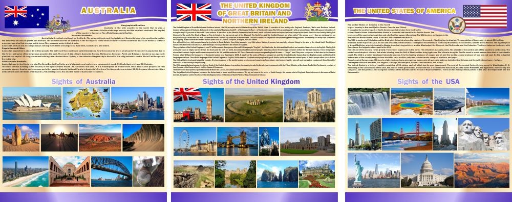 Великолепная наглядность для учебных комнат среднего и старшего школьного звена. Высококачественная полиграфия, четкие и понятные картинки, удивительные фотографии и интересный сопроводительный текст к каждому стенду. Этот комплект стендов для школы наверняка заинтересует каждого ученика, расширит диапазон его географических и политических знаний и, конечно, повысит уровень английского языка.