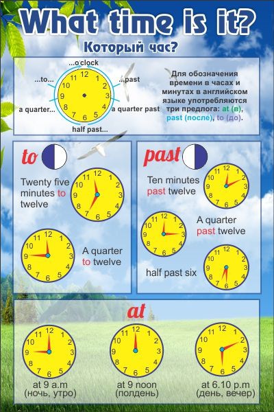 У большинства учеников во время изучения английского языка возникает масса трудностей со временем. В особенности, с предлогами. В этой таблице представлен справочный материал, который все хорошо объясняет. Стоит отметить, что вся информация написана на русском языке, это делает ее доступной даже для тех, кто только начал изучать английский язык. Не навязчивый фон акцентирует внимание на нужной информации, а не на себе, он не отвлекает от главного, основного, что есть на нем. Так же стенд оснащен примерами на английском языке и рисунками, делая весь материал еще более доступным для учеников.
