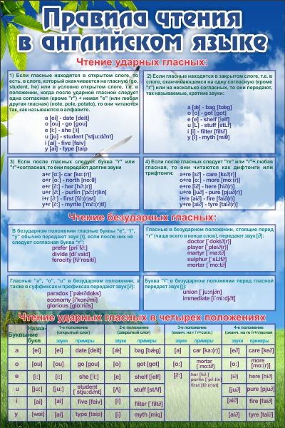 Многие люди бояться начать говорить с иностранцами на английском языке только потому, что их произношение далеко от идеала. На этом стенде в удобных таблицах написаны правила чтения в английском языке. Присутствуют правила чтения ударных гласных, безударных гласных и чтения ударных гласных в четырех положениях. Все правила написаны на русском языке, что делает данный стенд доступным даже тем людям, которые только начали изучать английский язык. Также большим плюсом является то, что каждое правило оснащено примером для лучшего понимания и усвоения материала. Фон спокойный и умиротворяющий, чтобы не отвлекать учеников от занятия.