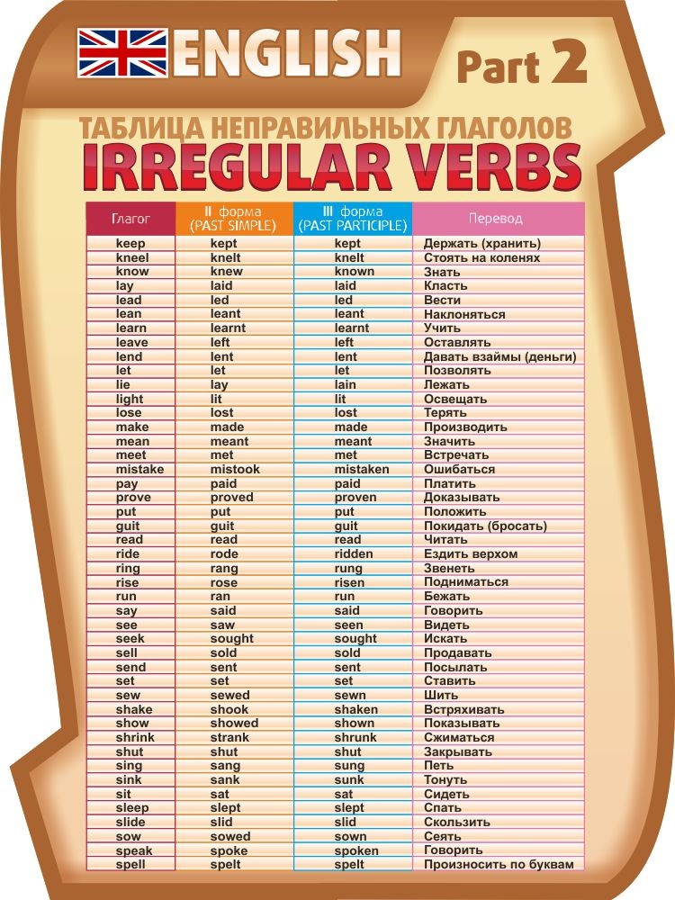 Вторая часть серии наглядных школьных пособий "ТАБЛИЦА НЕПРАВИЛЬНЫХ ГЛАГОЛОВ, ЧАСТЬ 2" подскажет ученикам правописание и русский перевод всех неправильных глаголов в английском языке от буквы K по букву S.  Слова представлены в алфавитном порядке - стандартная форма, Past Simple и Past Participle.