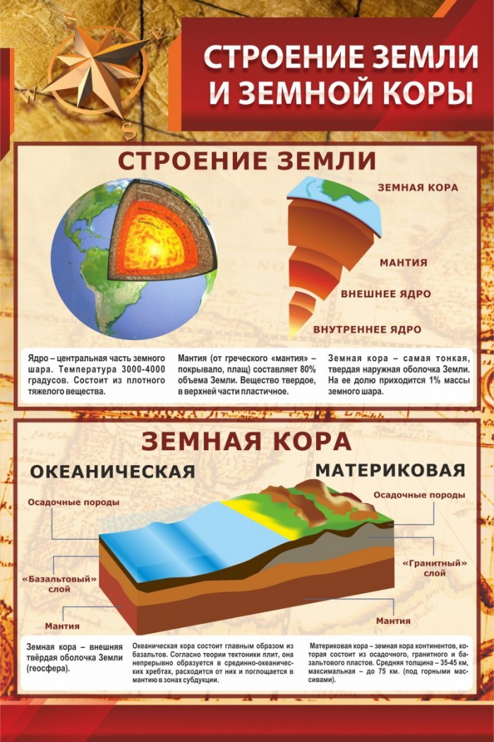 Удобный стенд для изучения земной коры и строения Земли. На нем представлены три изображения: Земли в разрезе, куска Земли и земной коры. Большой плюс данного стенда в том, что на нем не только подписан каждый слой, но и есть определения трудных и непонятных для учеников слов. Изображение земной коры разделено на два: океаническое и материковое строение.