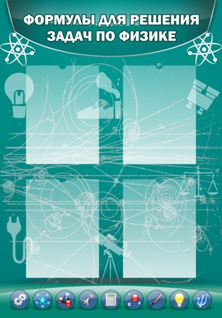 На уроках физики ученикам образовательных учреждений приходится решать различные сложные формулы, которые не всегда получается сразу запомнить. Стенд «Формулы для решения задач по физике» сделан для того, чтобы преподаватель мог использовать его как наглядное пособие для учеников школы, а четыре кармана размером 210х297 мм., вертикального вложения информации, позволяют учителю менять материал, который проходят школьники. Прозрачный материал карманов дает возможность читать расположенный в нем текст без каких-либо неудобств для зрения, принимая текст четким и информативным.