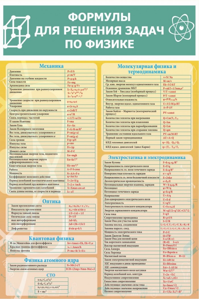 Физика — это современная наука, изучающая различные сложные формулы. Для того, чтобы учащиеся образовательных учреждений знали и быстрее запоминали все формулы, в кабинетах физики должен располагаться стенд «Формулы для решения задач по физике», который ученики смогут использовать как наглядное пособие и подсказку во время уроков. Стенд оформлен грамотно и понятно, а фоновый дизайн сделан так, чтобы стенд выделялся и позволял запомнить место его расположения в кабинете. Стенд выполнен из качественного и легкого материала ПВХ, который без каких-то проблем крепится на двухсторонний скотч или небольшие саморезы на любую стену.