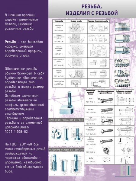 Такой стенд отлично подойдет не только для школы, но и для институтов с техническим уклоном. На нем школьники и студенты смогут найти информацию о изделиях с резьбой, изложенную в удобных таблицах с рисунками и чертежами. Стенд строг и аккуратен, без излишеств и отвлекающих деталей. Качество данного стенда на очень высоком уровне. ПВХ- пластик, пленка с фотопечатью, и ламинирующая пленка сделают стенд долгосрочным, сохранив его первоначальное состояние на долгое время. Краска не поблекнет и не потускнеет. А приятный фон будет радовать глаз учителю и ученикам. Он идеально впишется в любой класс.
