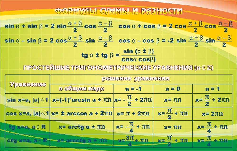 А вот и формулы разности и суммы. Здесь указаны в таблице примеры самых простеньких тригонометрических уравнений. В общем, основа основ, которая зачастую, понимается далеко ни каждым учеником. Яркий дизайн стенда обязательно повлияет положительным образом, на способность школьников, запомнить все, что здесь написано. Безусловно, и понять это, а не только лишь запомнить. Этот стенд – настоящая находка для каждого преподавателя сложной математической науки. Многие школы игнорируют важность подобных стендов, и совершенно зря. Но главное, что некоторые учителя знают, как важны такие стенды, чтобы легче и доступнее, объяснить всю необходимую информацию и донести ее до каждого школьника!