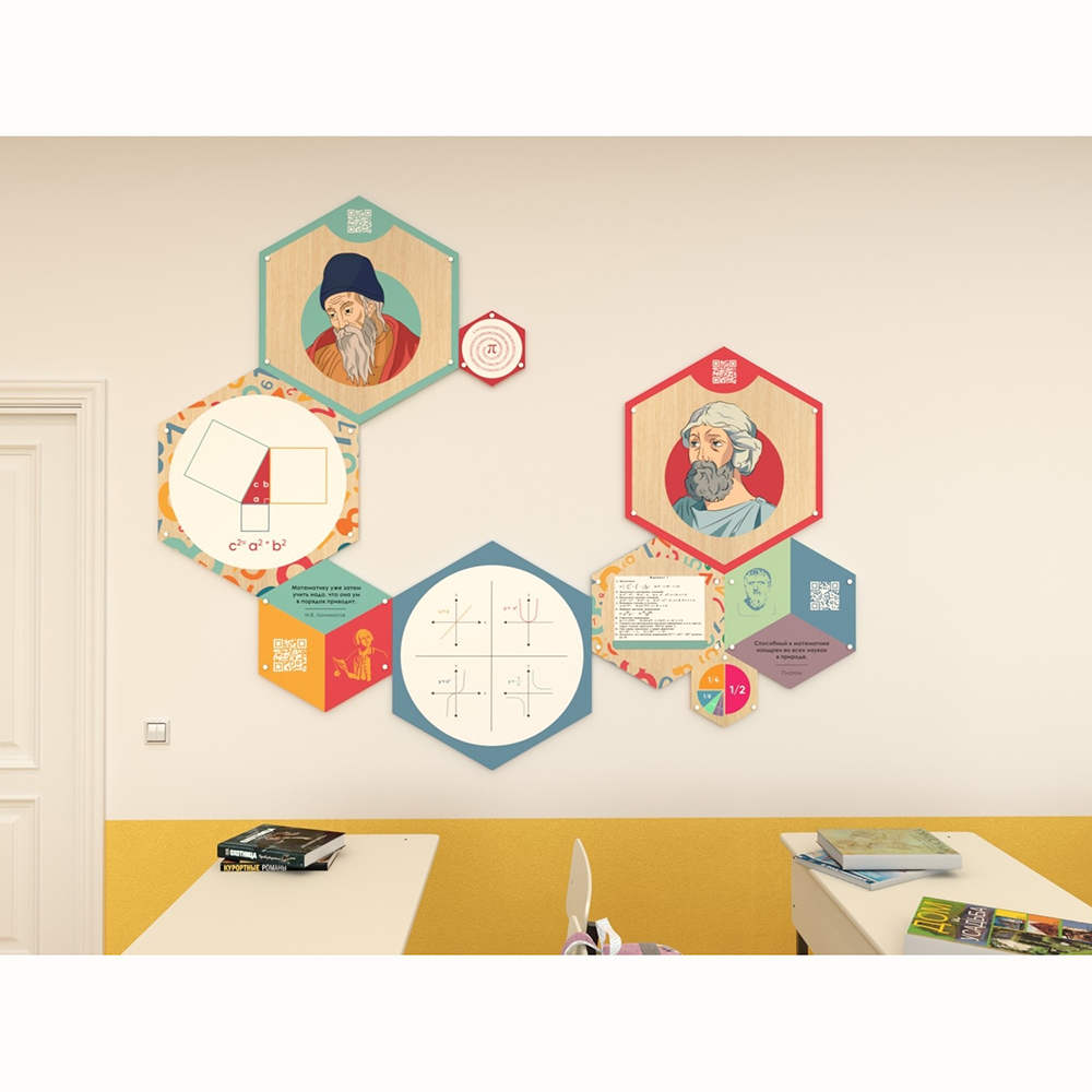Каждый шестигранник содержит обучающую информацию: портреты выдающихся людей, их достижения и великие цитаты, основные постулаты науки, формулы, графики, теоремы. Благодаря qr-кодам дети могут подробнее узнать об учёных, изображённых на портретах, стоит только навести на них телефон.