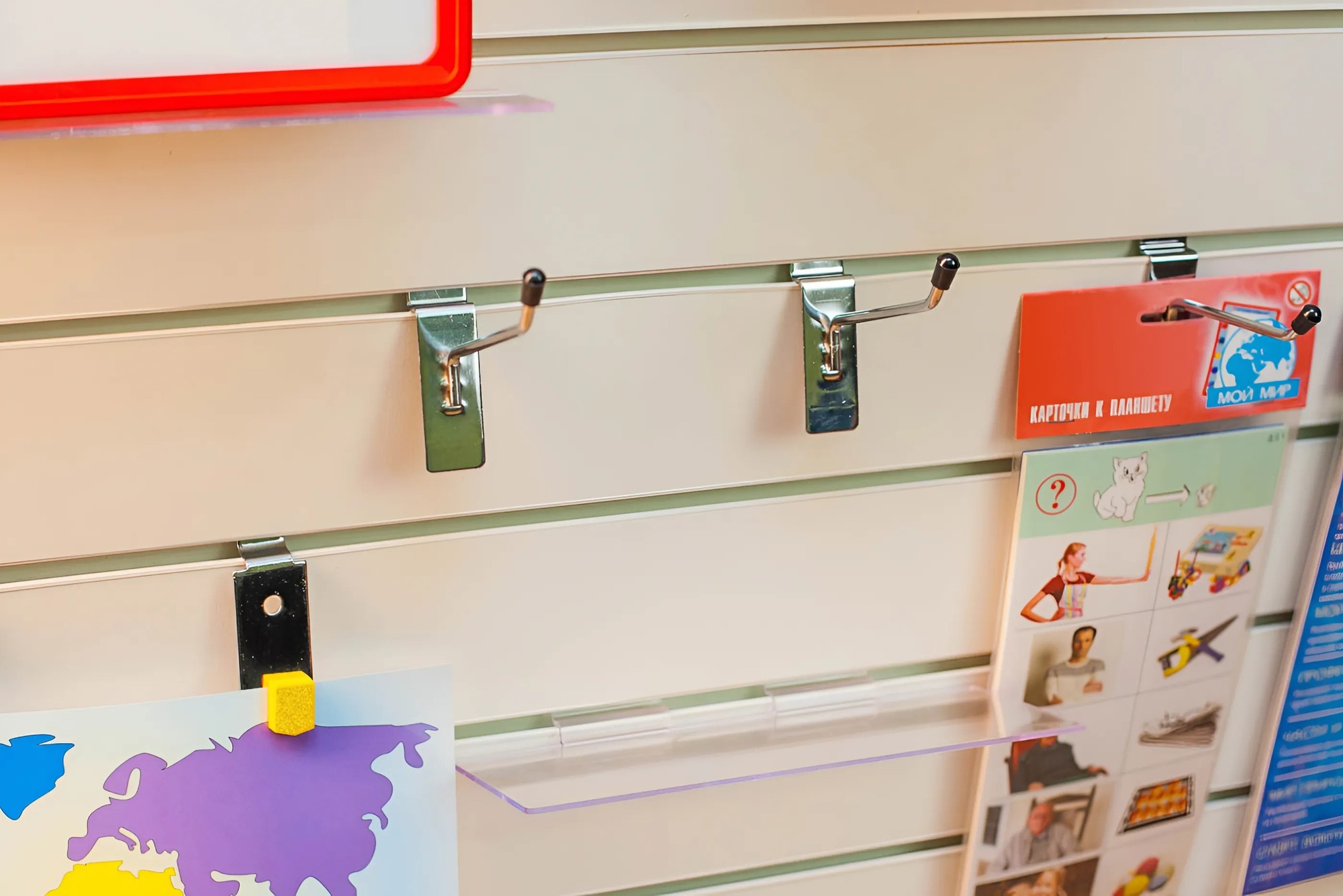 Стенд представляет собой ламинированный щит с пазами для крепления аксессуаров: набора полок, крюков, магнитных держателей и подвесок. Аксессуары вставляются в пазы щита и размещаются на стенде в удобном для экспозиции месте.