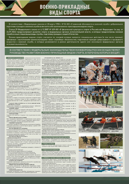 Стенд представляет собой информационную панель, на которой  размещены сведения о военно-прикладных видах спорта, а также выдержки из Федерального закона "О физической культуре и спорте в Российской Федерации". Стенд предназначен для наглядного отображения информации о видах спорта, способствующих подготовке к военной службе, а также формирования у учащихся или курсантов осознанного отношения к спортивному образу жизни.