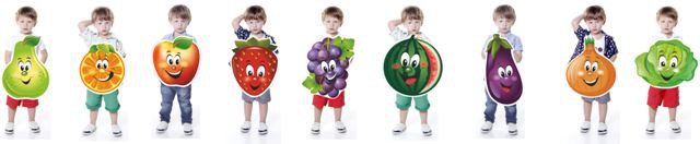 В данном наборе 9 костюмов с изображением фруктов, овощей и ягод. В набор входят – груша, апельсин, яблоко, баклажан, лук, капуста, клубника, виноград, арбуз