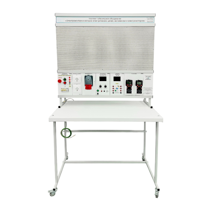 Комплект лабораторного оборудования «Электромонтаж и наладка электрических цепей, автоматики и электромоторов» выполнен в стендовом исполнении: стойка с модулями и монтажной панелью, установленная на собственном лабораторном столе.