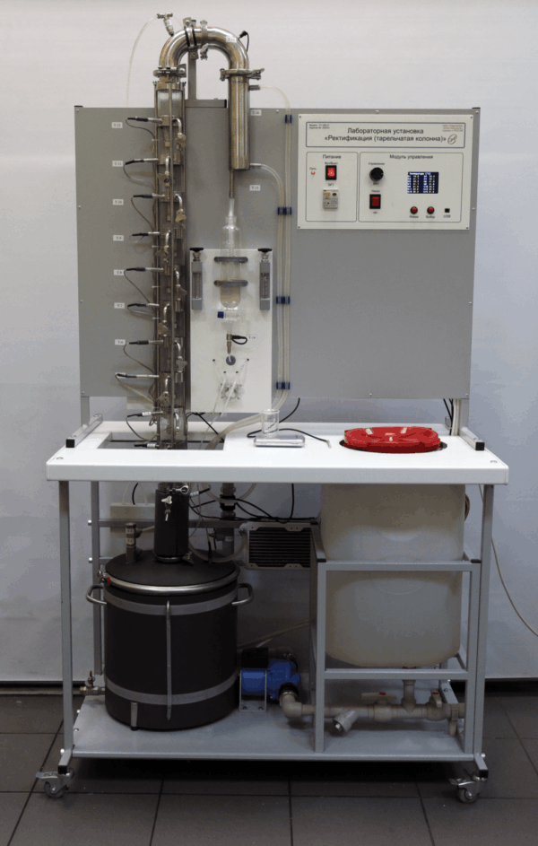 Установка позволяет проводить изучение фазовых переходов в сложных растворах при ректификации этилового спирта на тарельчатой колонне периодического действия.