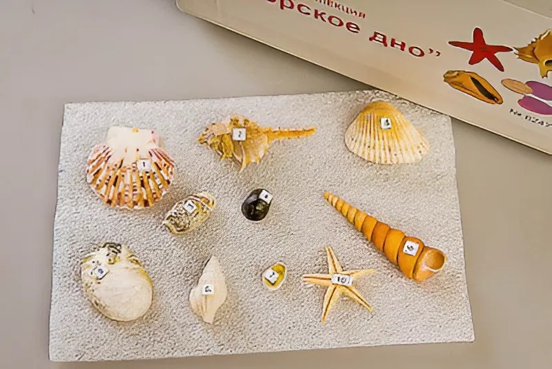 Коллекция включает биологические объекты, которые можно встретить на морском дне: морские звезды, раковины моллюсков. Объекты пронумерованы соответственно списку, смонтированы на листе пенополиуретана и упакованы в картонную коробку.