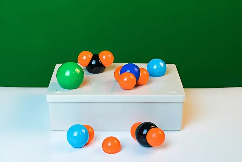 Набор состоит из пластмассовых шаров (моделей атомов) и соединительных втулок. Для удобства работы с моделями применен метод цветового кодирования.