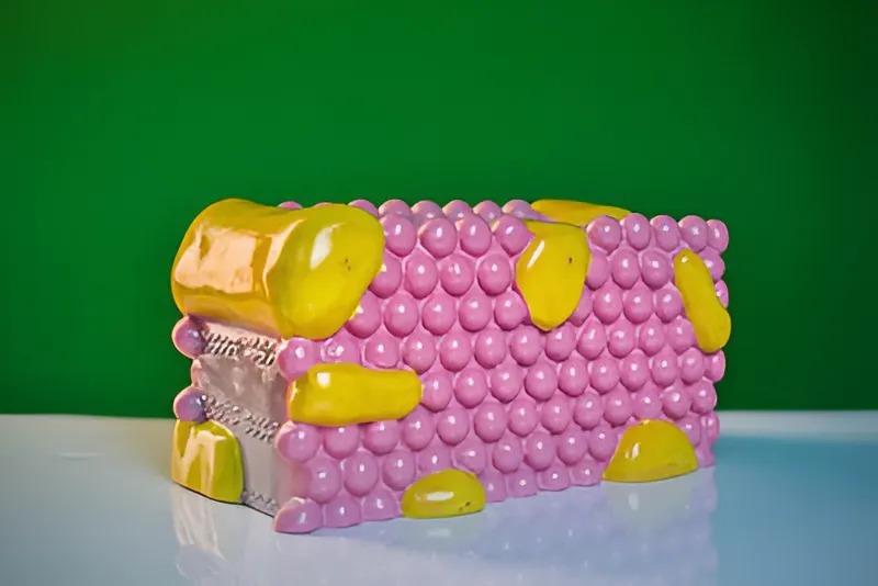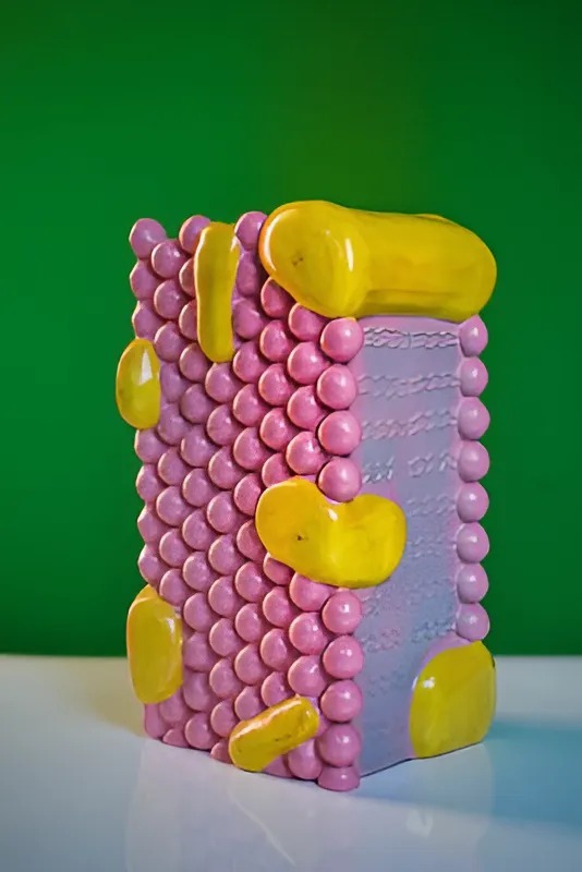 Модель высотой около 12 см, изготовлена из пластмассы, раскрашена. Демонстрирует строение клеточной оболочки (плазмалеммы). На модели представлены детали строения клеточной оболочки: белки и липиды.
